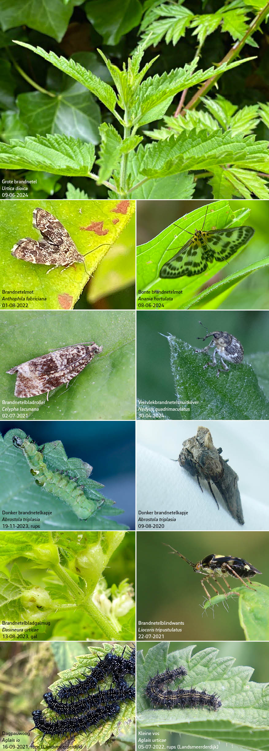 Het valt mij in de afgelopen jaren op dat er naast vlinders ook nog nachtvlinders en andere insecten dol op brandnetel zijn. Ik heb eens in mijn archief gekeken welke insectennamen er het woord ‘brandnetel’ bevatten en vond er zeven, waarvan sommige echte tongbrekers: de Brandnetelmot, de Bonte brandnetelmot, de Brandnetelbladroller, het Donker brandnetelkapje, de Viervlekbrandnetelsnuitkever, de Brandnetelbladgalmug en de Brandnetelblindwants. En dan zijn er ook nog de eerder genoemde rupsen van dagvlinders die van brandnetels leven, zoals Dagpauwoog, Kleine vos, Gehakkelde aurelia, Atalanta, Distelvlinder en het Landkaartje.
